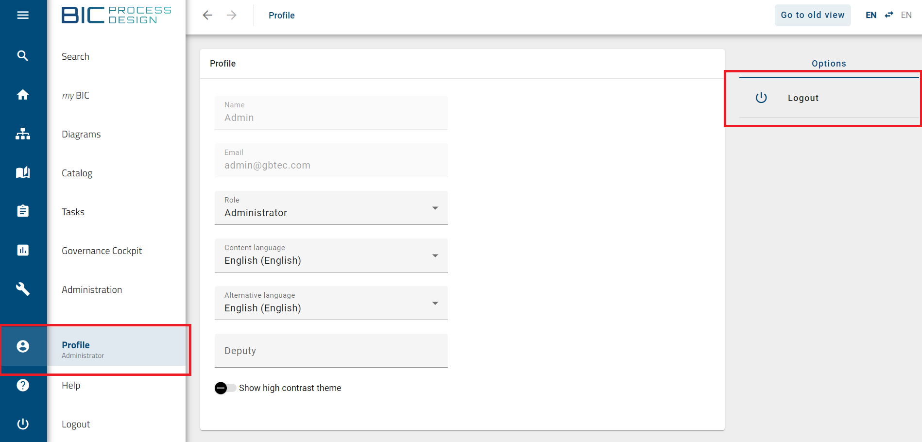 If you click on the profile icon in the collapsed menu, the short profile will appear. The short profile shows your email address, your active user role and the switch to (de-)activate the high contrast theme.